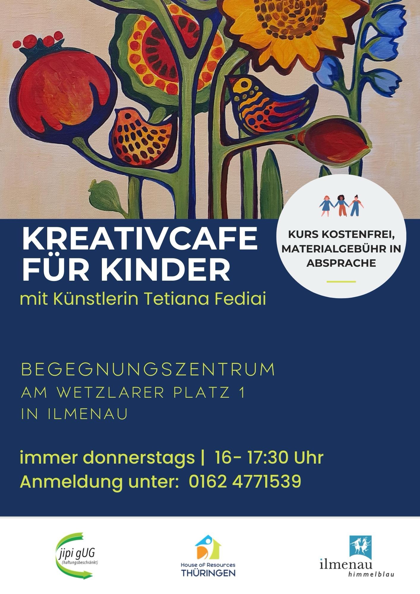 Die Kreativcafés mit Tetiana Fediai finden in unserem Begegnungszentrum „Am Wetzlarer Platz“ in Ilmenau statt. Aktuell laufen folgende Kurse: Kreativcafé für Kinder immer donnerstags 16-17:30 Uhr Kreativcafé für Erwachsene immer montags 18-20 Uhr Die Kurse sind kostenlos. Je nach Absprache kann eine Materialgebühr anfallen. Wir bitten um Anmeldung unter: 0162 4771539