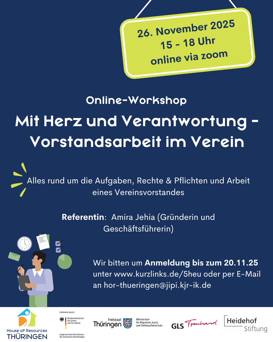 Wir laden Euch herzlich zum Qualifizierungsworkshop „Mit Herz und Verantwortung – Vorstandsarbeit im Verein“ ein. Der Workshop findet am Mittwoch, den 26.11.2025 von 15 – 18 Uhr online via zoom statt.