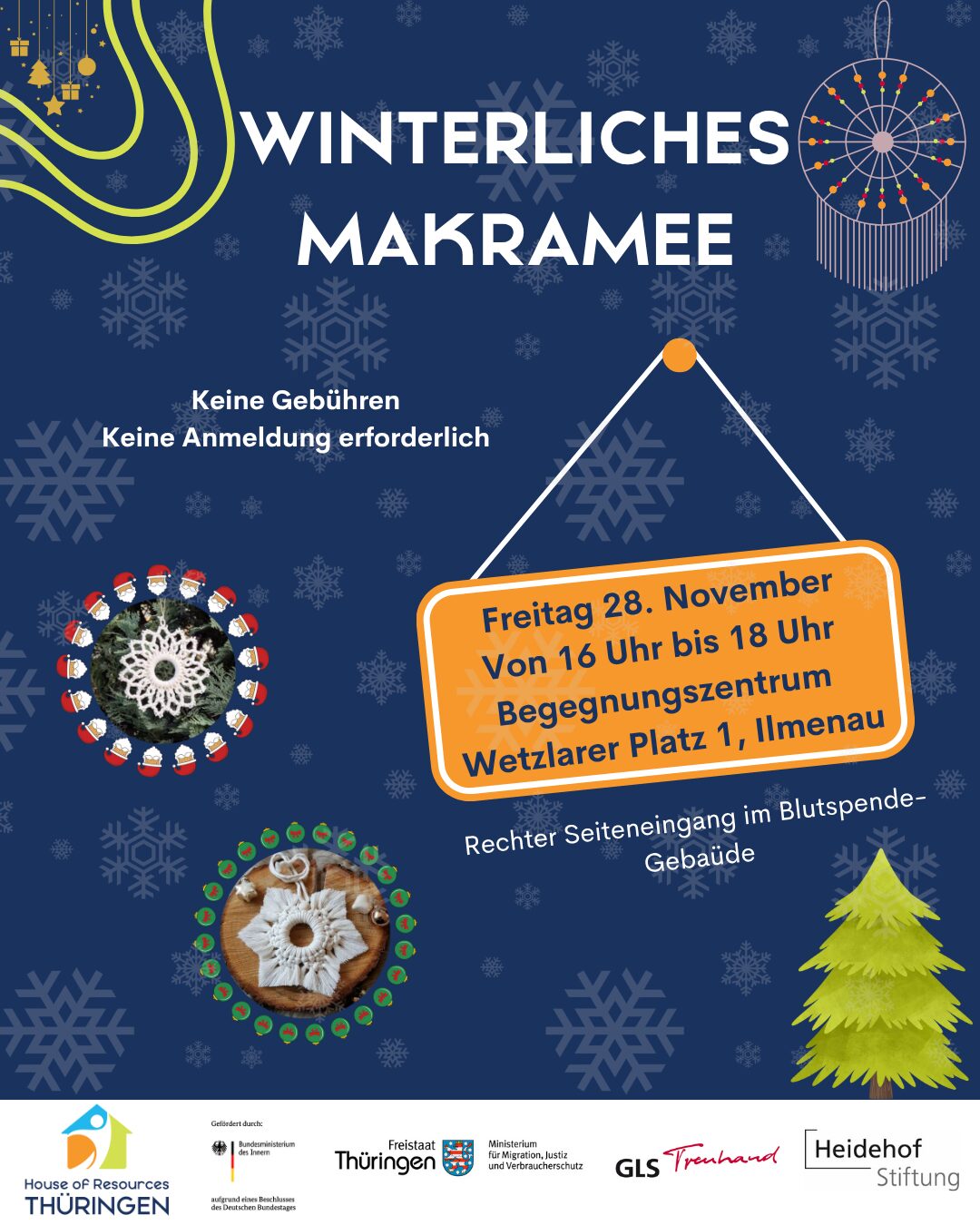 Wir laden euch am 28.11.2025 herzlich zu unserem gemütlichen Makramee-Workshop im Begegnungszentrum am Wetzlarer Platz 1 in Ilmenau (rechter Seiteneingang im Blutspendegebäude) ein.
